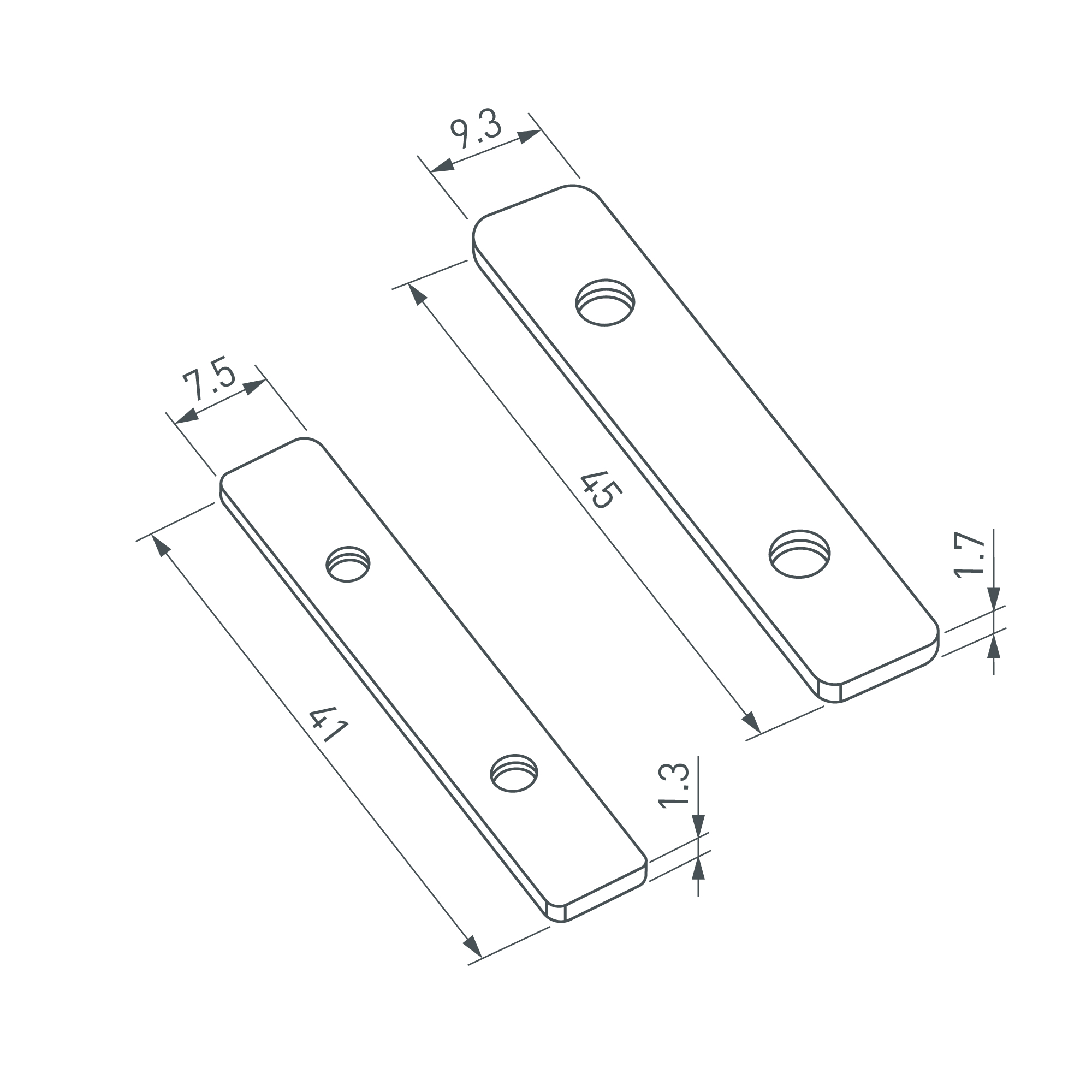 Коннекторы (4 шт. - два внутренних и два внешних) для соединения двух отрезков профилей LINE-6070 в прямую линию. Устанавливаются в паз, фиксируются идущими в комплекте винтами. Внешний соединитель с размерами 9,3x45,1мм крепится в верхнем пазе профиля LINE-6070. Соединитель внутренний имеет размеры 7,6x41,1мм и фиксируется в нижнем внутреннем пазе профиля LINE-6070. Применяются при изготовлении светильников длиной, превышающей длину профиля.