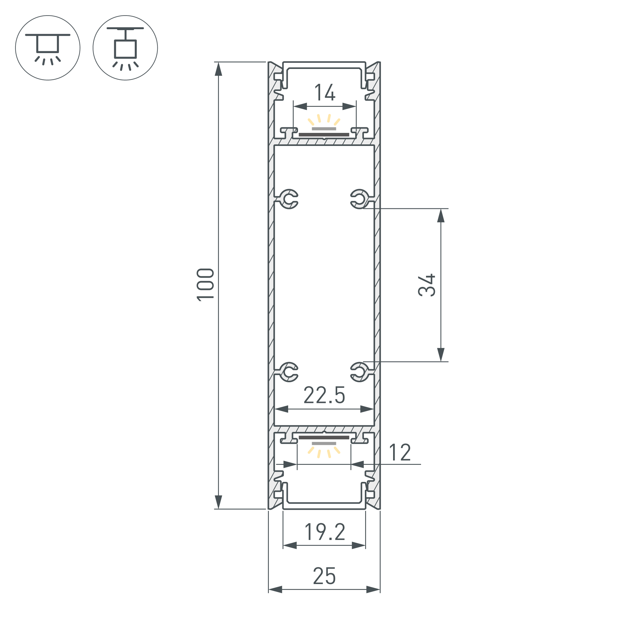Под заказ от 100 м. Алюминиевый профиль для светодиодных лент и линеек, свечение вверх и вниз. Цвет - серебристый RAL9006 (порошковая окраска). Габаритные размеры (L×W×H): 2500x25x100 мм. Ширина площадки для ленты 12 мм. Экраны, заглушки и другие аксессуары приобретаются отдельно. Цена за 1 метр.