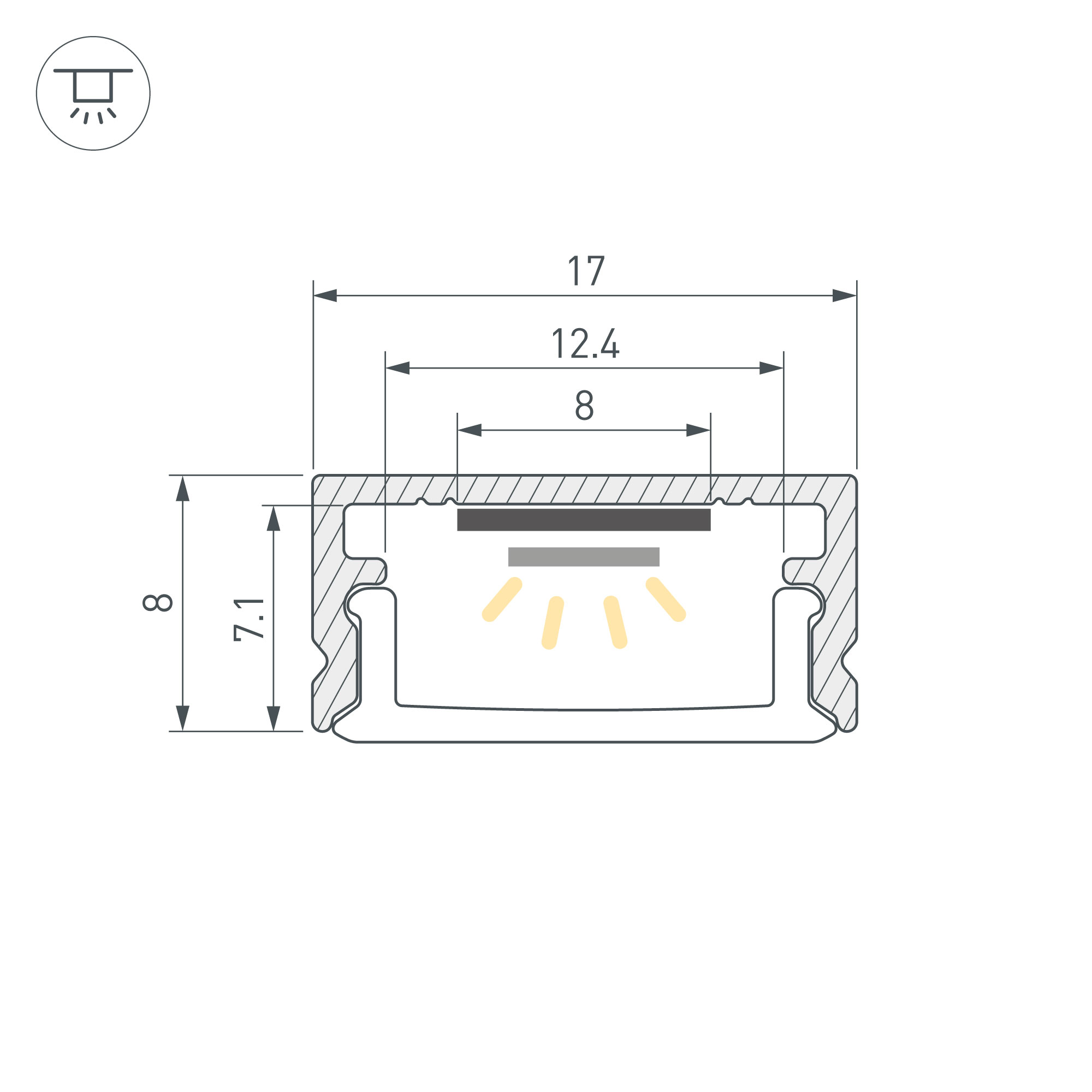 В комплект входят: накладной профиль из анодированного алюминия, матовый экран со светопропусканием 64,5%, заглушки и держатели, а также открытая светодиодная лента со свободной резкой шириной 8 мм и мощностью 14 Вт/м. Светодиоды SMD 2216 (200 шт/м) дневного цвета свечения (4000 К). Напряжение питания 24 В. Минимальный отрезок 5 мм. Габаритные размеры набора составляют 2000 мм в длину, 17 мм в ширину и 8 мм в высоту. Для создания из набора одного светильника необходимо использовать одну глухую заглушку и одну заглушку с кабелем 1 метра и разъёмом 5,5DC Female. При необходимости отрежьте часть профиля необходимой длины (минимальный отрезок – 5 мм). Разрезать ленту необходимо только в обозначенных местах, отступив от края профиля на 3-5 мм строго по линии резки.