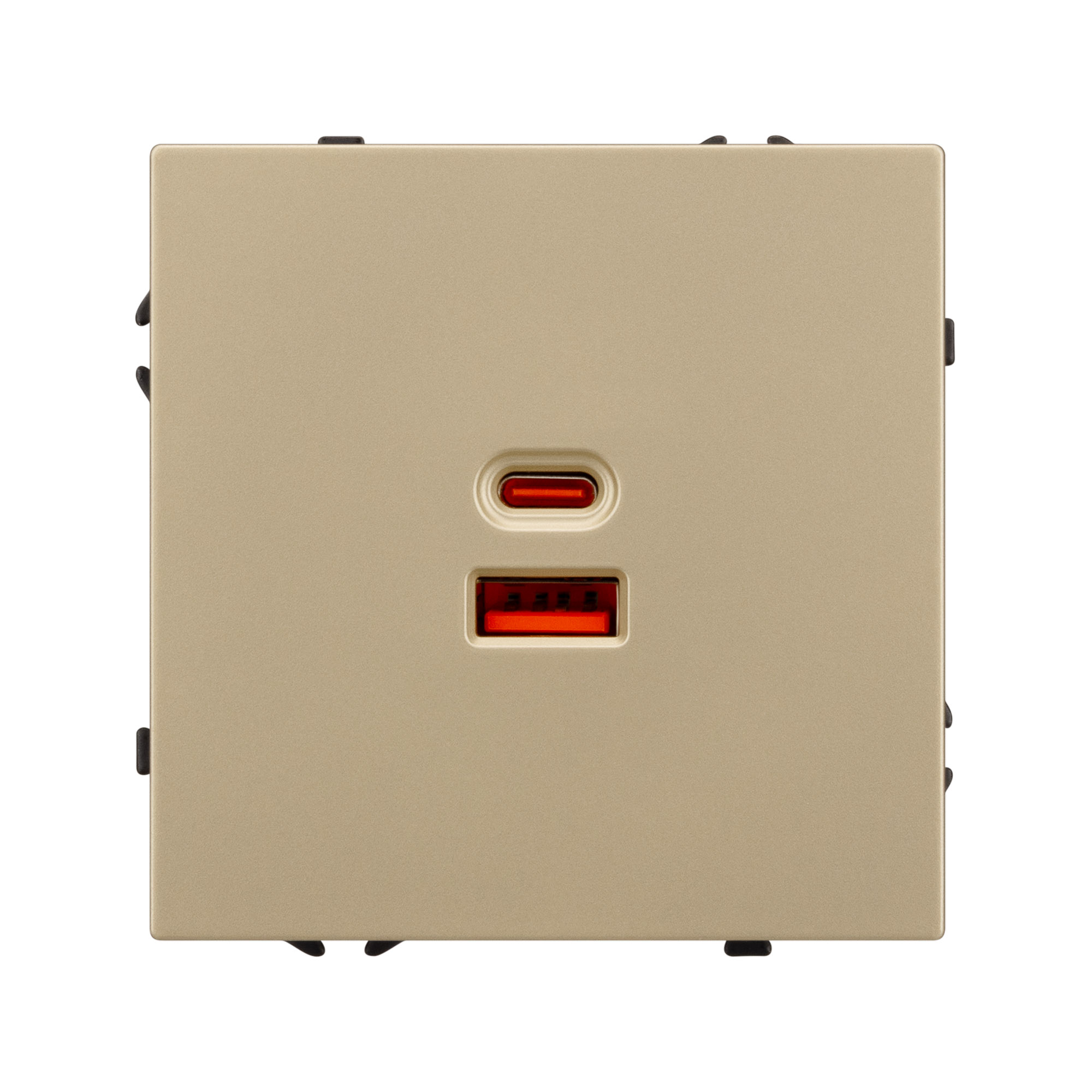 Механизм розетки с быстрой USB зарядкой на 2 порта. Цвет - золотой песок, с Soft-Touch покрытием. Без фронтальной рамки. Уровень пылевлагозащиты IP20. Тип подключаемого разъема - USB Type A + Type C. Устанавливается в стандартный подрозетник круглого сечения диаметром 60мм. Габаритные размеры: длина 71 мм, ширина 71 мм, высота 42 мм. Гарантийный срок 10 лет.