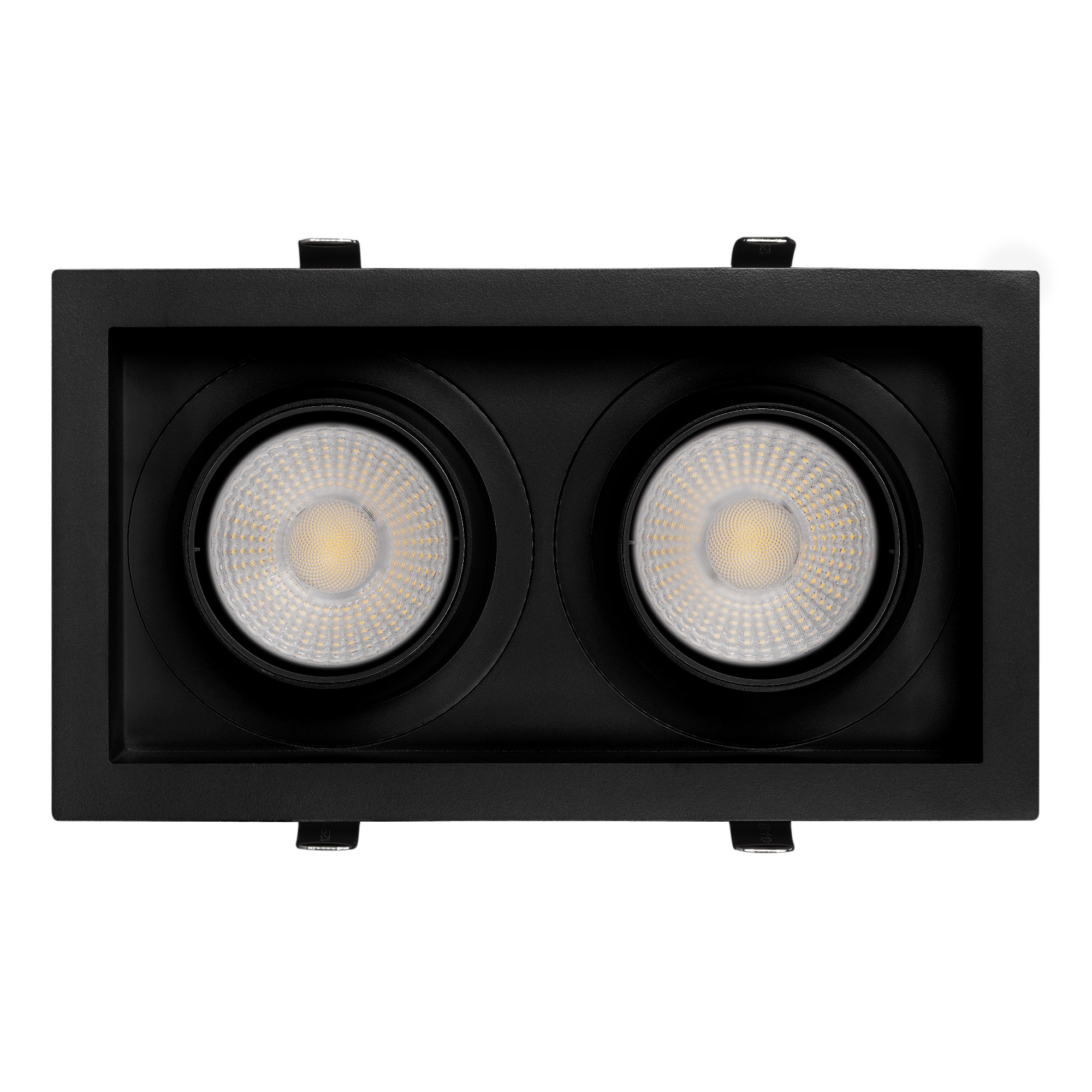 Поставка под заказ от 24 шт. Встраиваемый карданный светильник. Мощность 2х30 Вт, св. поток 5300 лм, 88 лм/Вт, тёплый 3000 K, CRI>92, угол 50°, напряжение питания 230 В. Чёрный корпус из алюминия, черная вставка, степень защиты IP20. Размер: длина 250 мм, ширина 140 мм, высота 125 мм. Монтаж встраиваемый, установочное отверстие: длина 230 мм, ширина 120 мм. Драйвер 24-42 В, 750 мА, пульсация <2%.