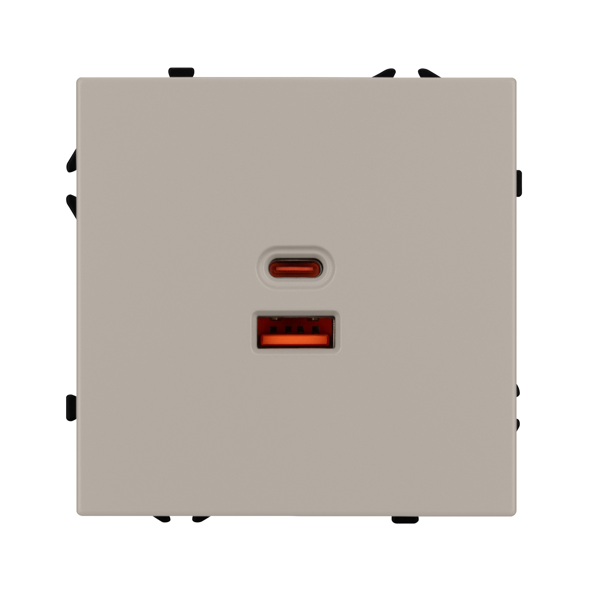 Механизм розетки с быстрой USB зарядкой на 2 порта. Цвет - кашемир, с Soft-Touch поверхностью. Без фронтальной рамки. Уровень пылевлагозащиты IP20. Тип подключаемого разъема - USB Type A + Type C. Устанавливается в стандартный подрозетник круглого сечения диаметром 60мм. Габаритные размеры: длина 71 мм, ширина 71 мм, высота 42 мм. Гарантийный срок 10 лет.