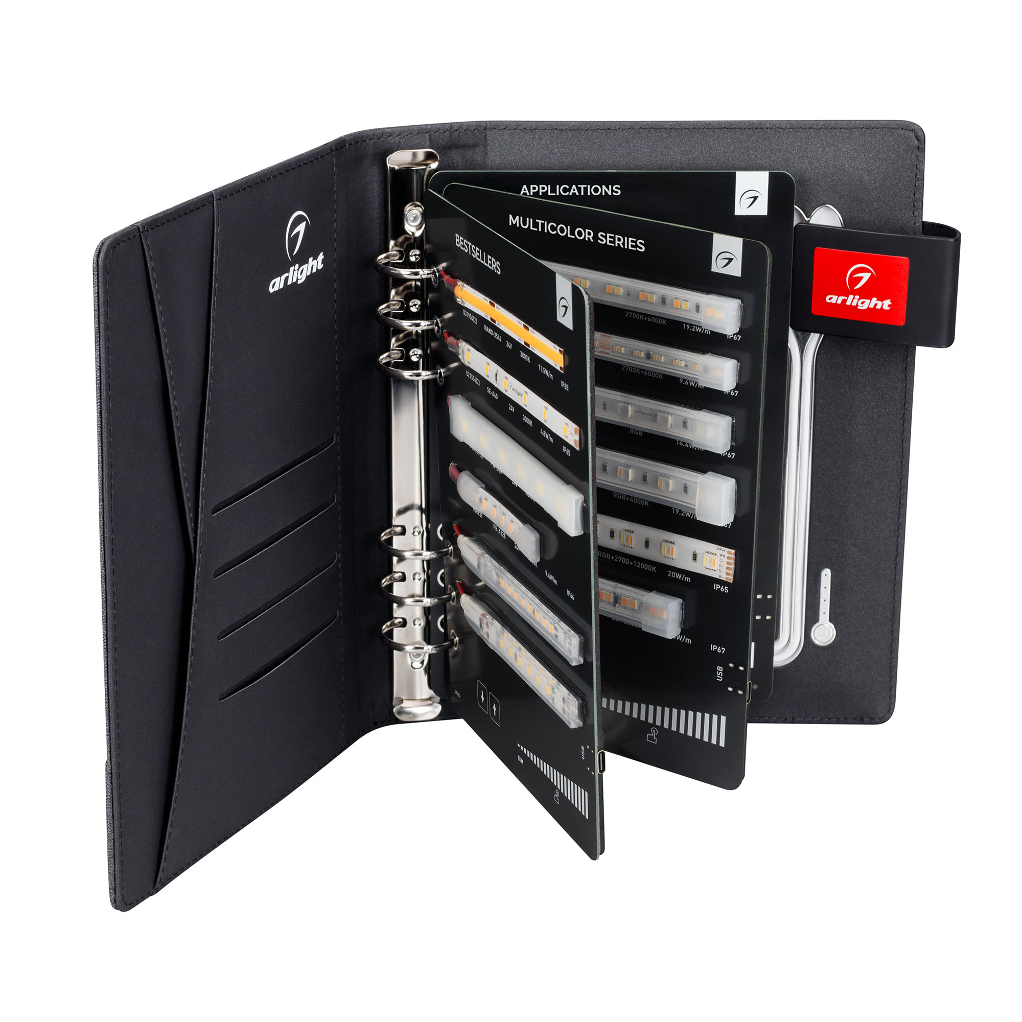 Демонстрационный набор герметичных светодиодных лент ARLIGHT. В кейс входят 17 образцов моделей лент COB, RTW, MICROLED, MIX, MOONLIGHT. Размер 235х180х80 мм. Демо-кейс работает от Power Bank (8000 mAh). В комплекте 3 разъема для подключения и 1 разъем для зарядки.