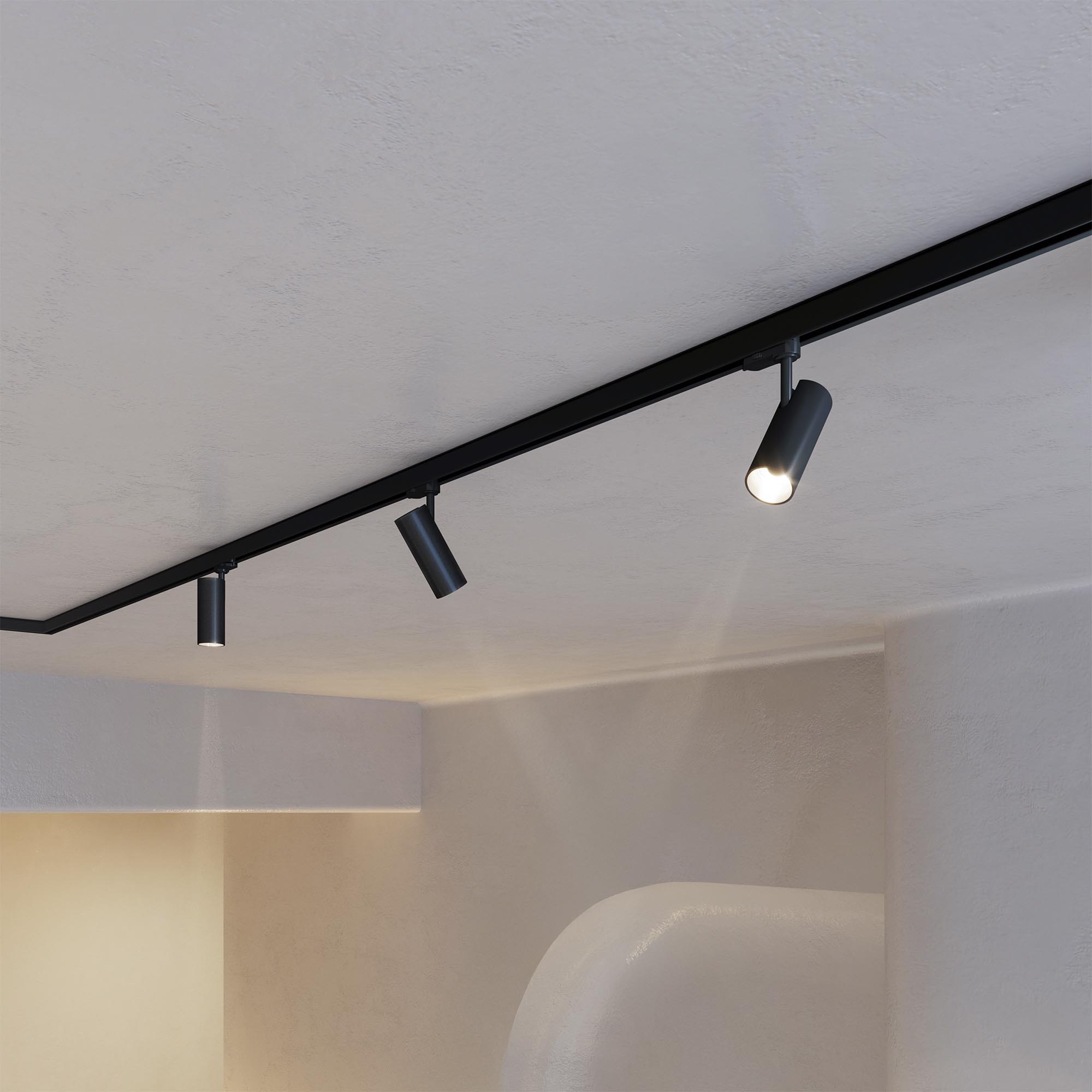Светильник для треков/шин 4 провода. Мощность 4 Вт, св. поток 95 лм, 23 лм/Вт, теплый 3000 K, CRI>90, угол 4°, напряжение питания 230 В. Черный круглый корпус из алюминия, материал линзы PMMA, степень защиты IP20. Размер: диаметр 55 мм, длина световой части 131 мм. Монтаж на трек 3-фазный. Драйвер встроенный 2-4 В, 700мА., пульсация <1%
