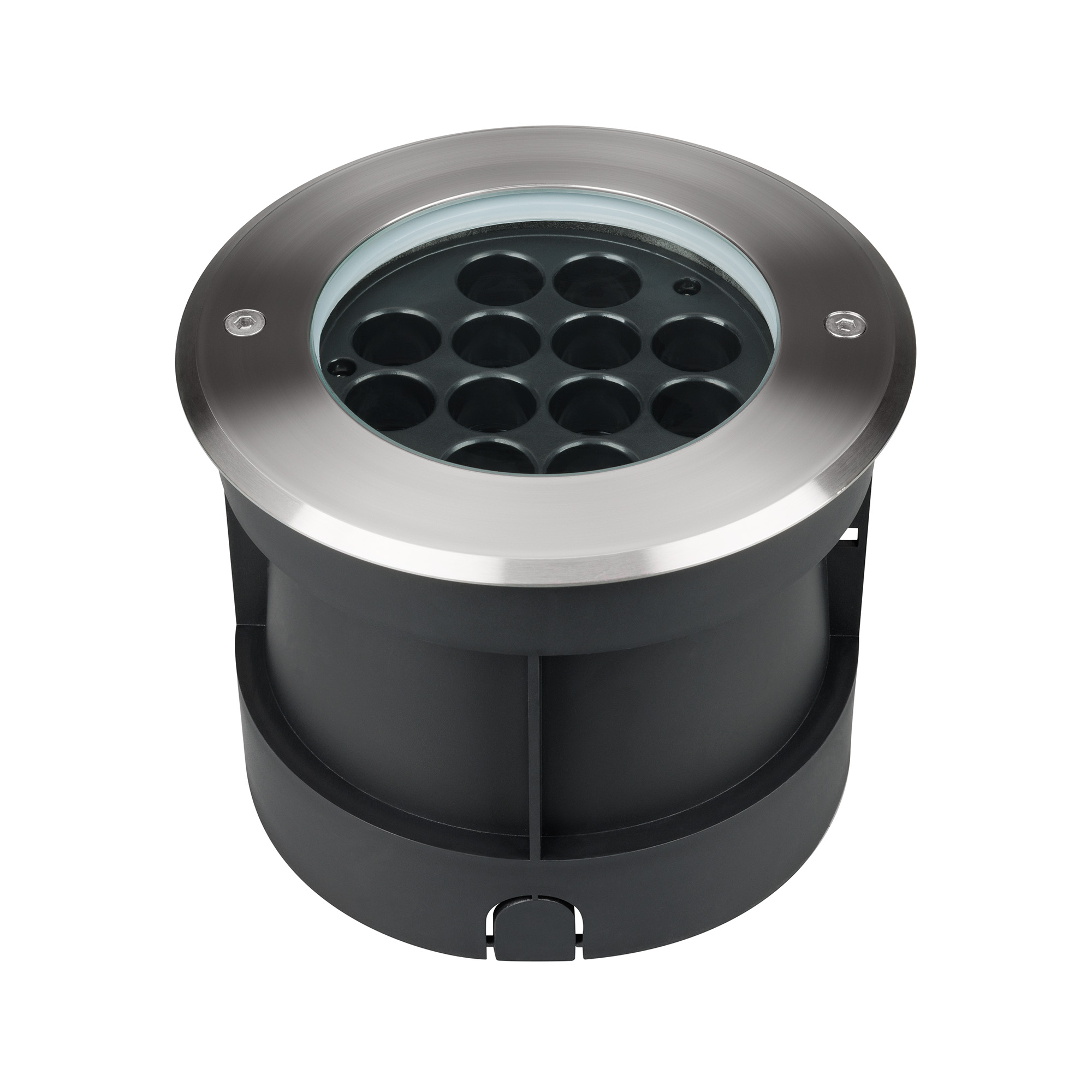 Встраиваемый светодиодный светильник для грунта и пола. Мощность 25 Вт, световой поток 2157 лм, цвет теплый 3000К. CRI(Ra)>80, угол 45°. Круглый влагозащищенный корпус IP67, нержавеющая сталь. Экран закалённое стекло. Питание 230В, 25Вт. Размер DxH Ø180x140мм. Установка в отверстие DxH Ø166x137мм.