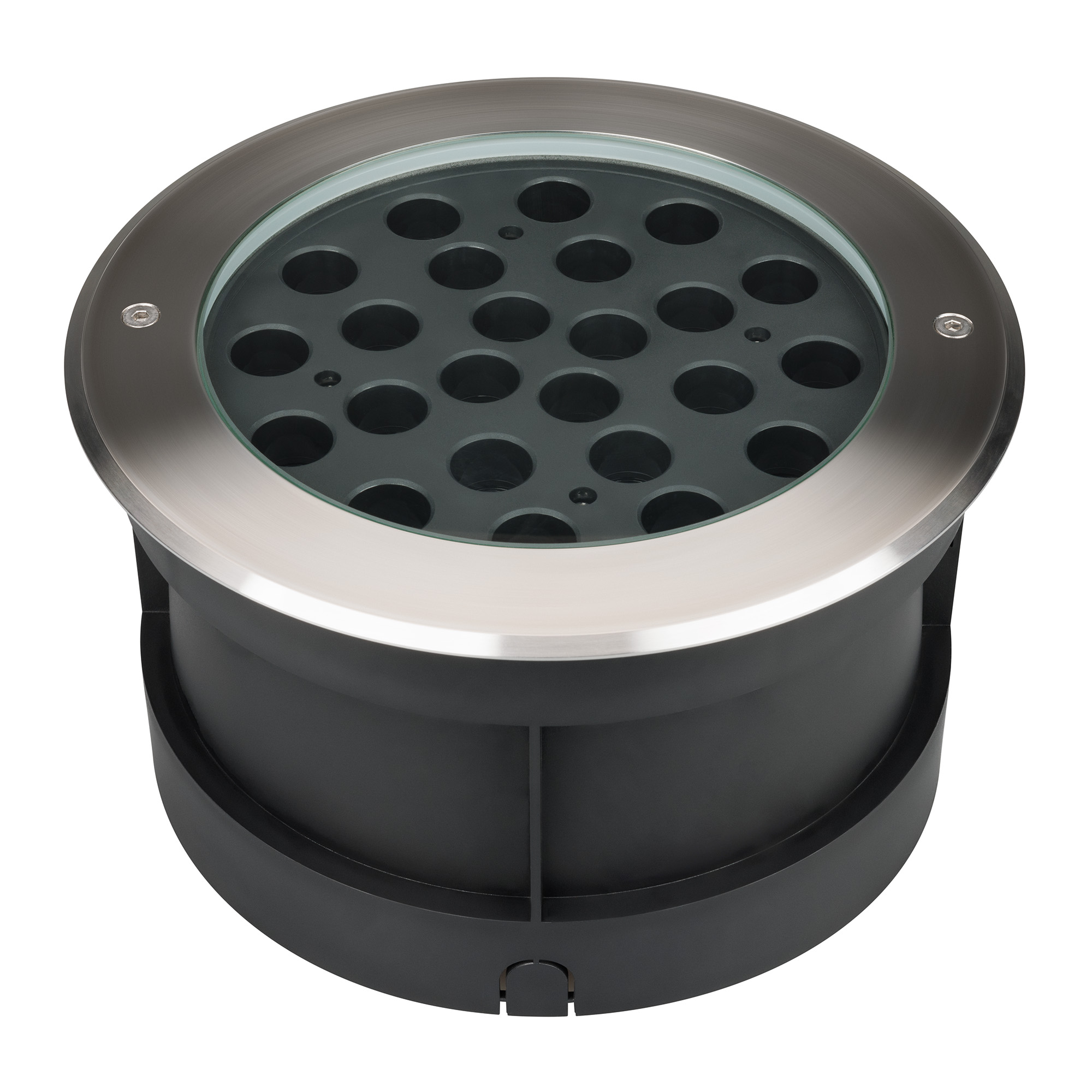 Встраиваемый светодиодный светильник LTD-DAFNA мощностью 48 Вт, теплого цвета свечения (3000К), со световым потоком 3250 лм предназначен для ландшафтного освещения парковых и садовых дорожек, придомовых территорий, а также декоративной подсветки фасада. Узкий угол излучения 35° позволяет создать четкий акцент на подсвечиваемом объекте. Ударопрочный круглый корпус из нержавеющей стали и алюминия Ø260x150 мм и экран из закаленного стекла толщиной надежно защищают оптический блок со светодиодом от внешних воздействий. Степень пылевлагозащиты корпуса на уровне IP67 рассчитана на длительное использование на открытом воздухе, а так же обеспечивает надежную работу в неблагоприятных условиях. Установка в отверстие ДxВ Ø240x150 мм. Светильник поставляется в сборе с драйвером и питающим кабелем, что позволяет легко и быстро подключить его к сети 230 В.