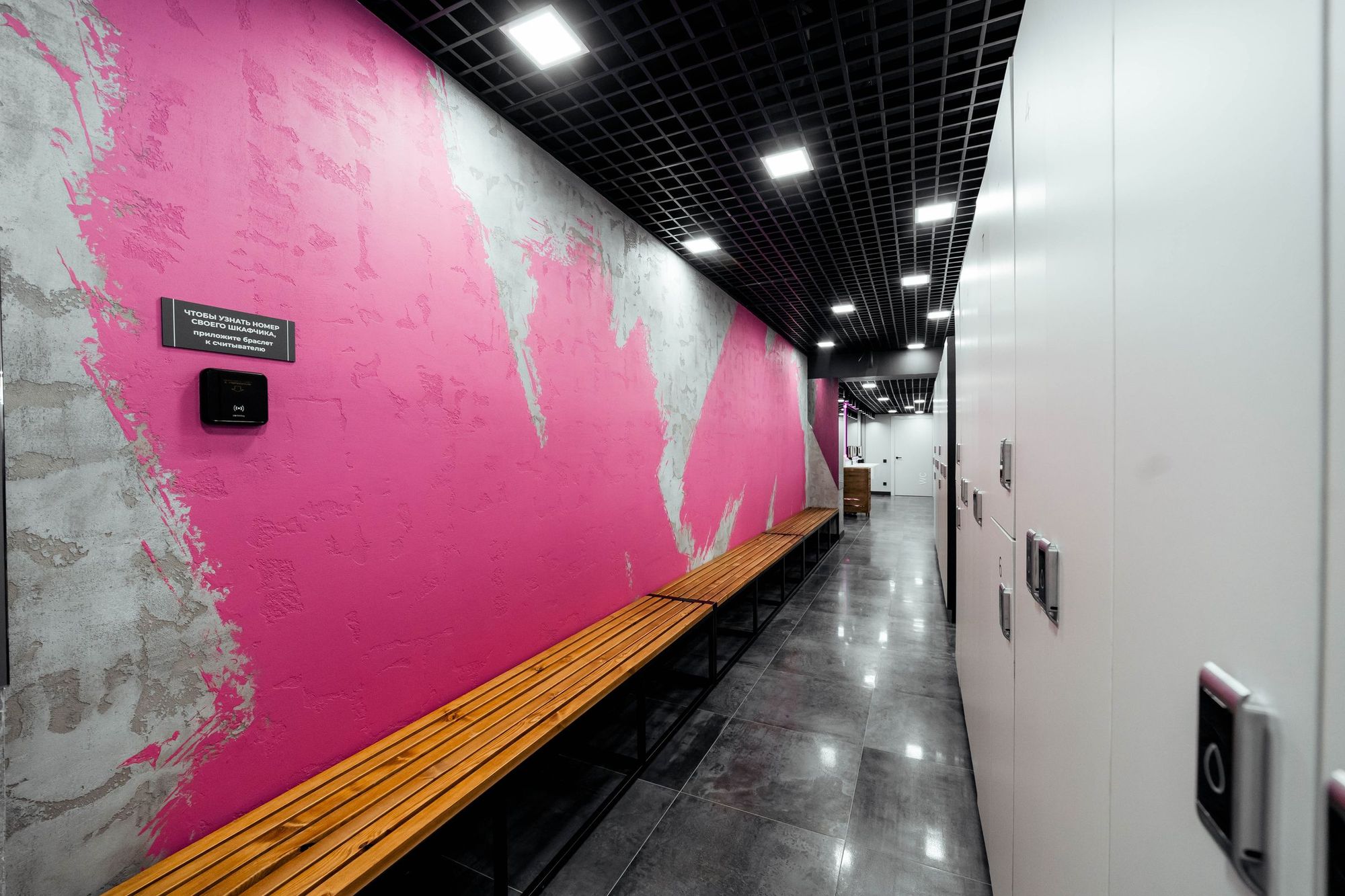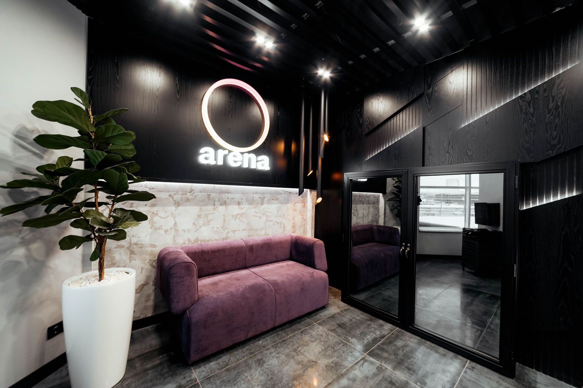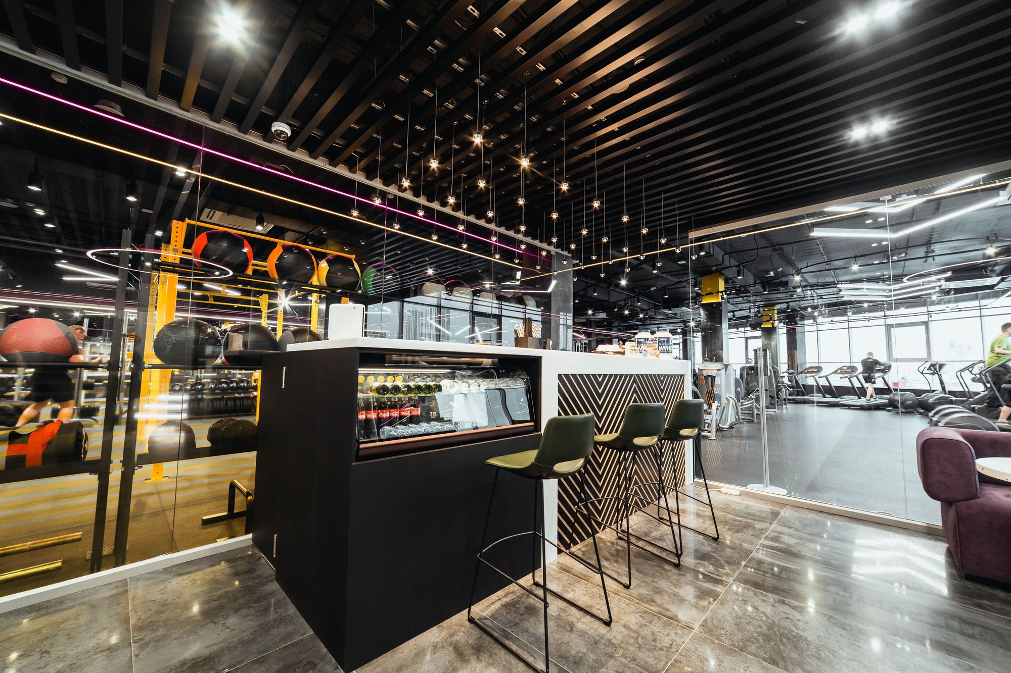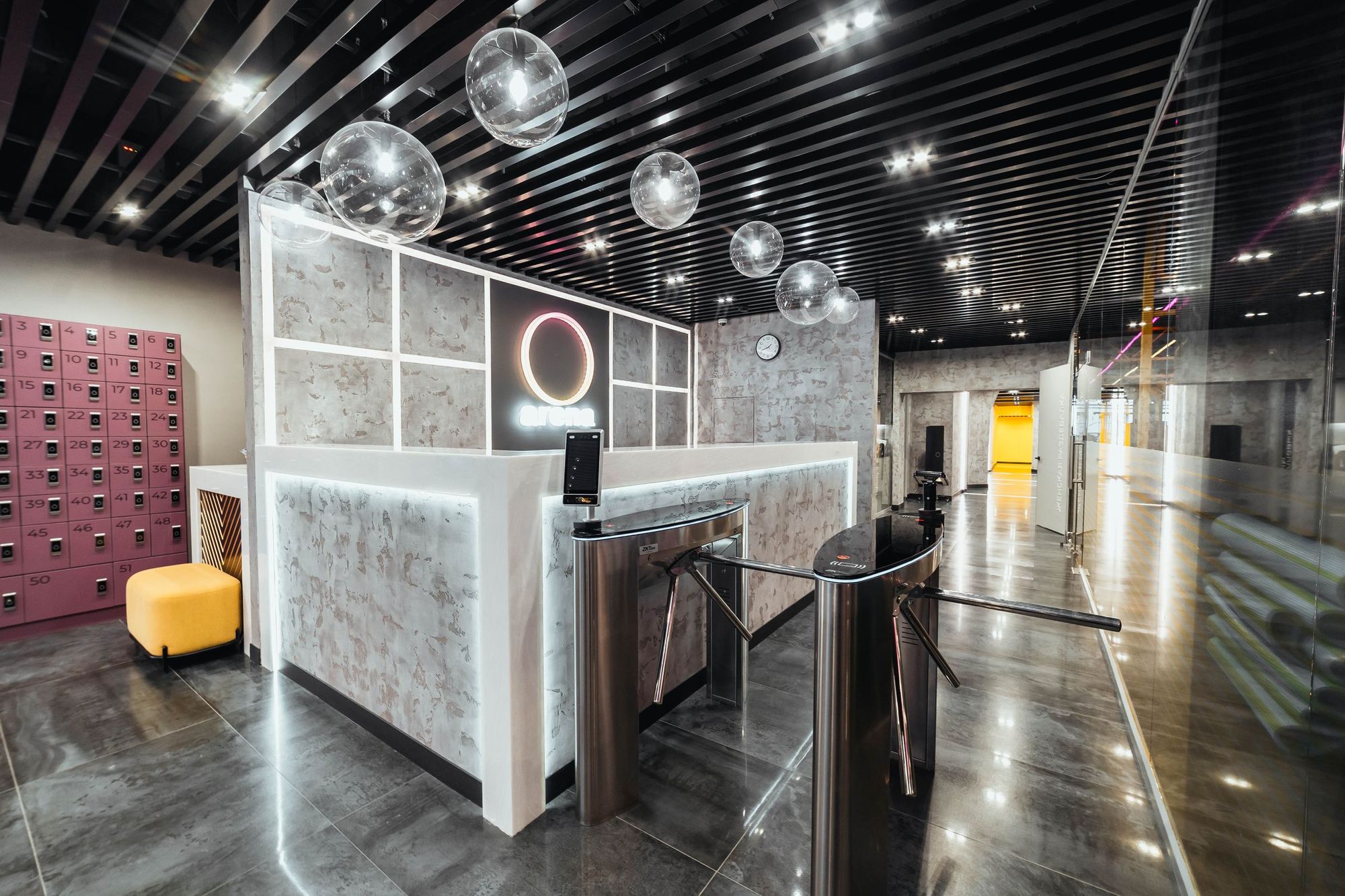 С помощью подвесных светильников из профиля, выполненных в виде стрелок, получилось показать динамику и вдохновить посетителей клуба на активные тренировки. За счет использования профилей с матовым экраном достигается эффект приятного рассеянного освещения.