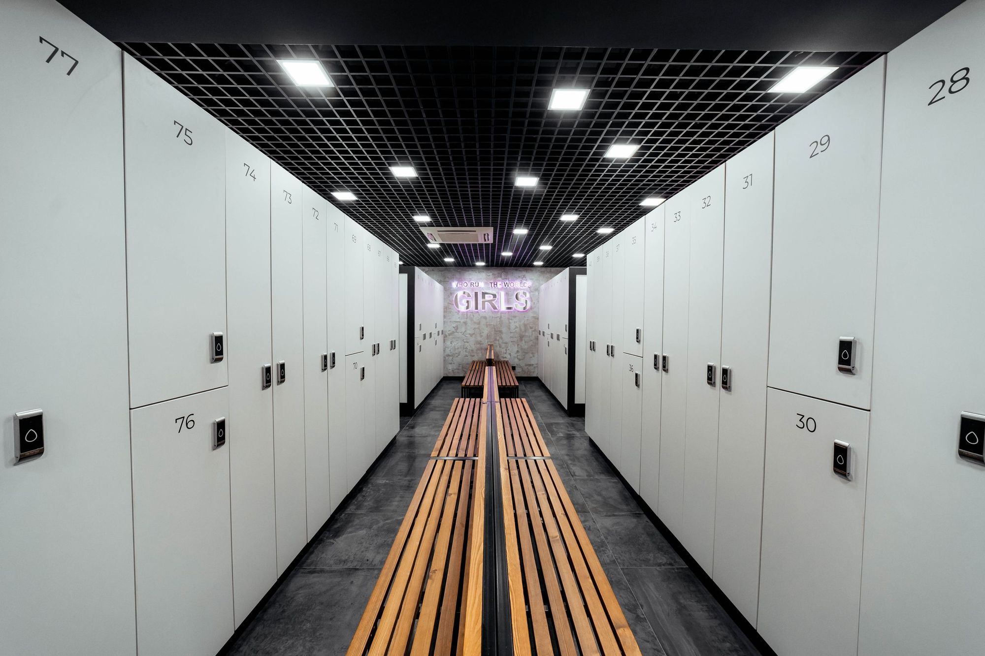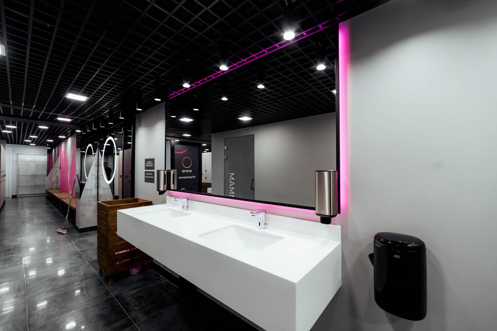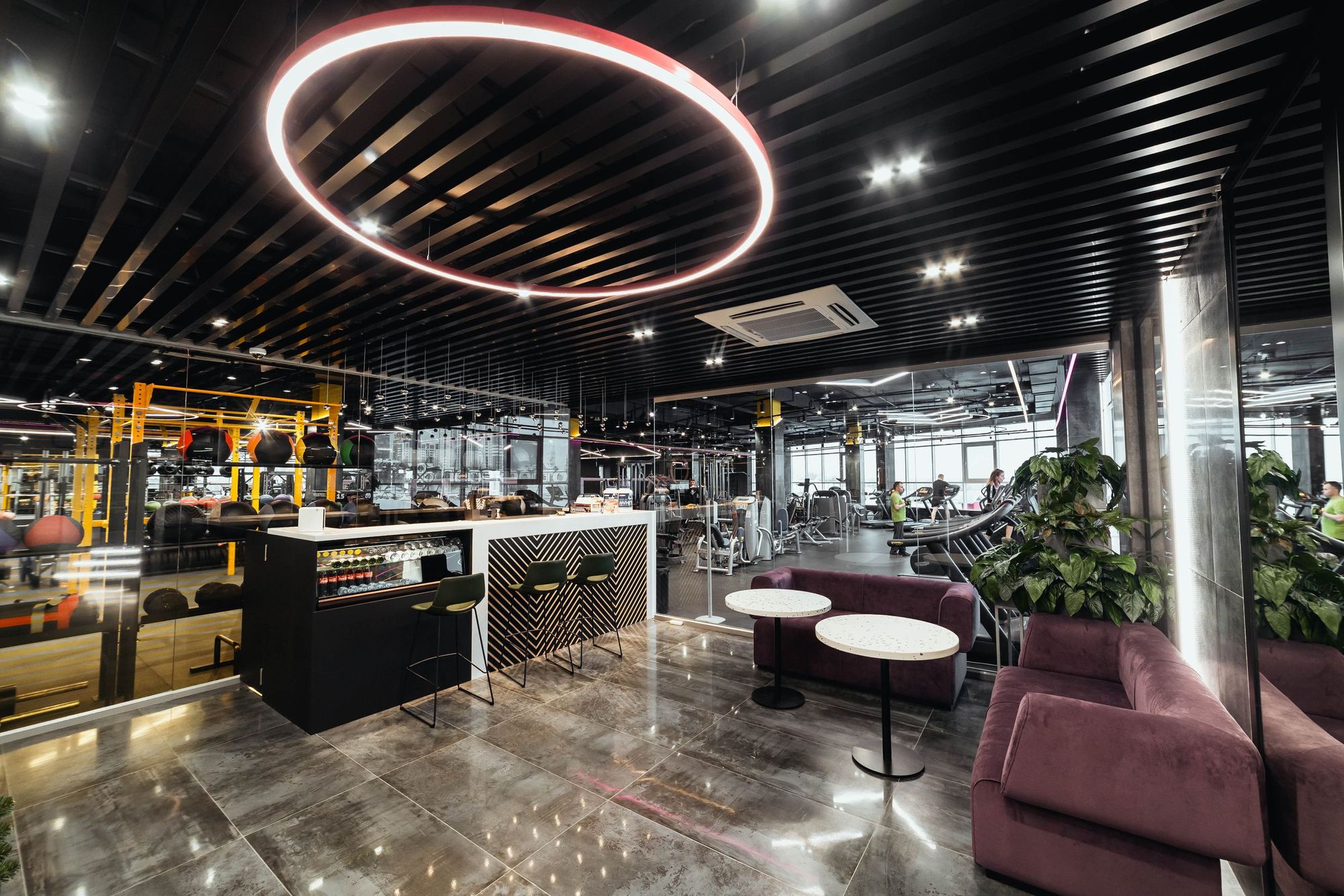 С помощью подвесных светильников из профиля, выполненных в виде стрелок, получилось показать динамику и вдохновить посетителей клуба на активные тренировки. За счет использования профилей с матовым экраном достигается эффект приятного рассеянного освещения.