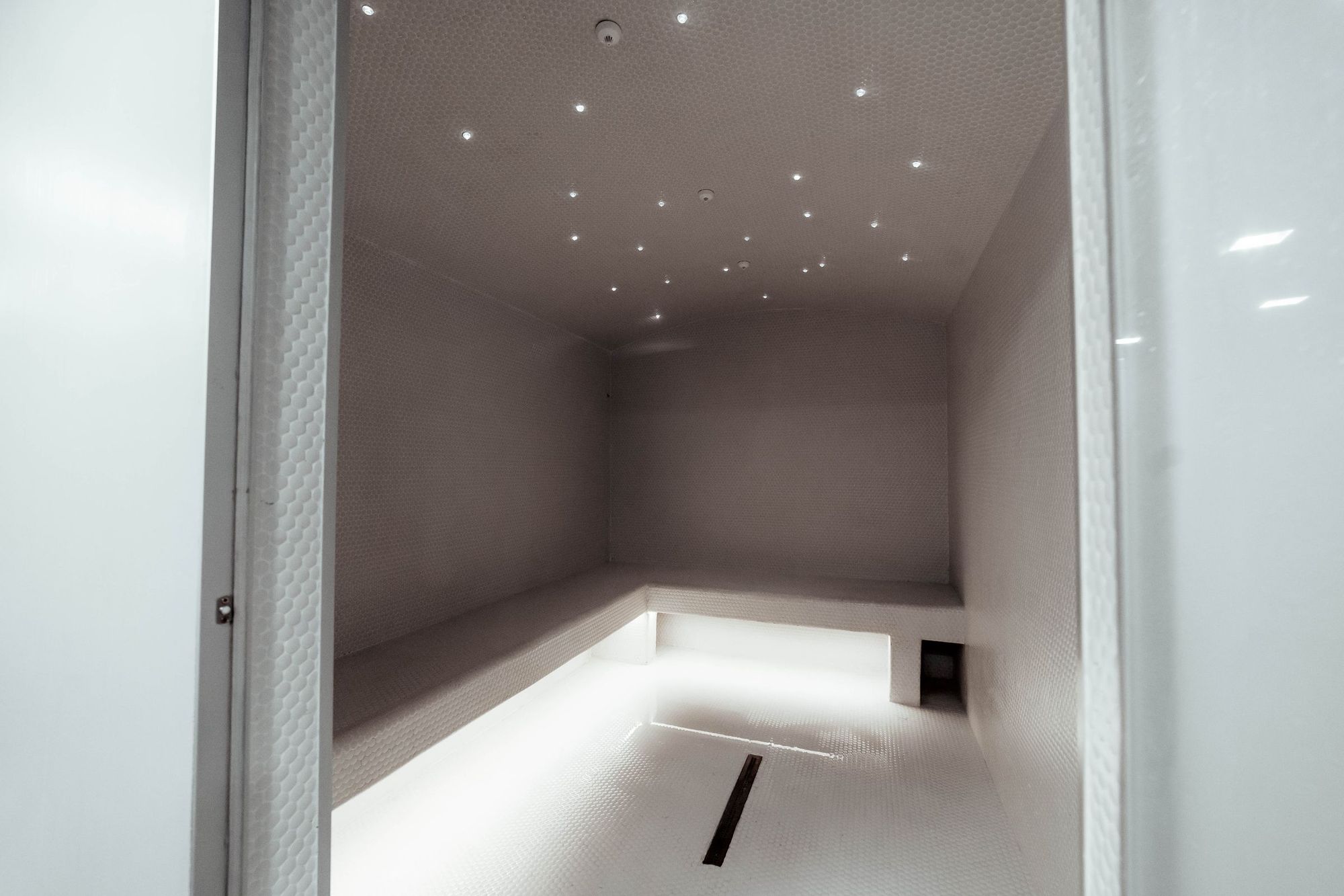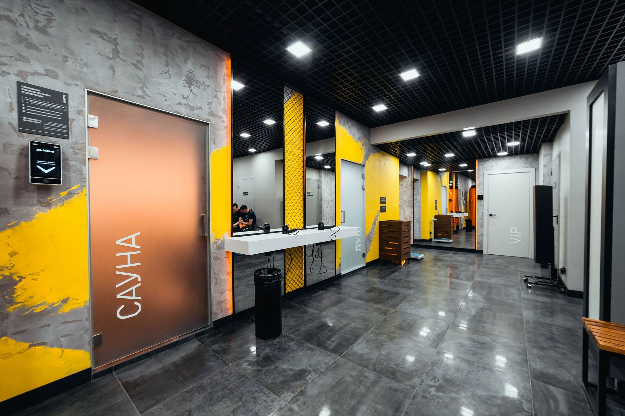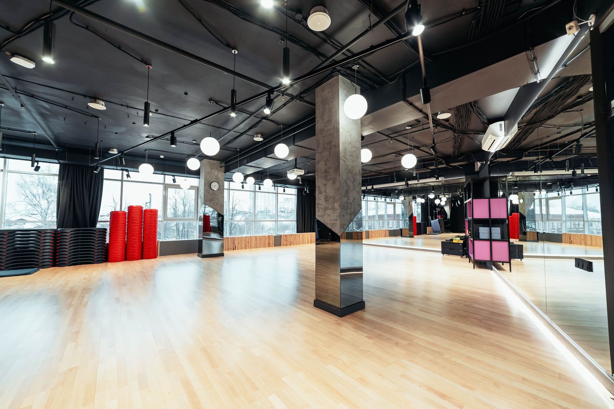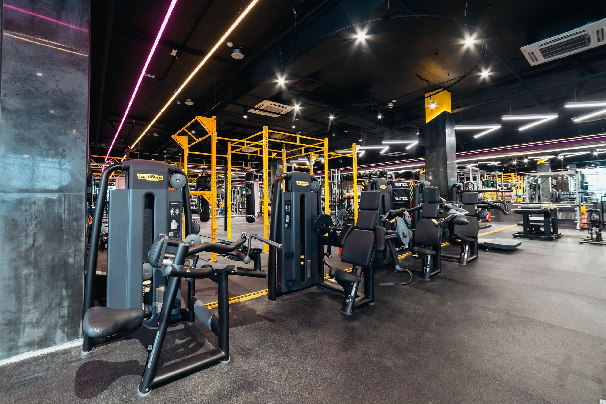 С помощью подвесных светильников из профиля, выполненных в виде стрелок, получилось показать динамику и вдохновить посетителей клуба на активные тренировки. За счет использования профилей с матовым экраном достигается эффект приятного рассеянного освещения.