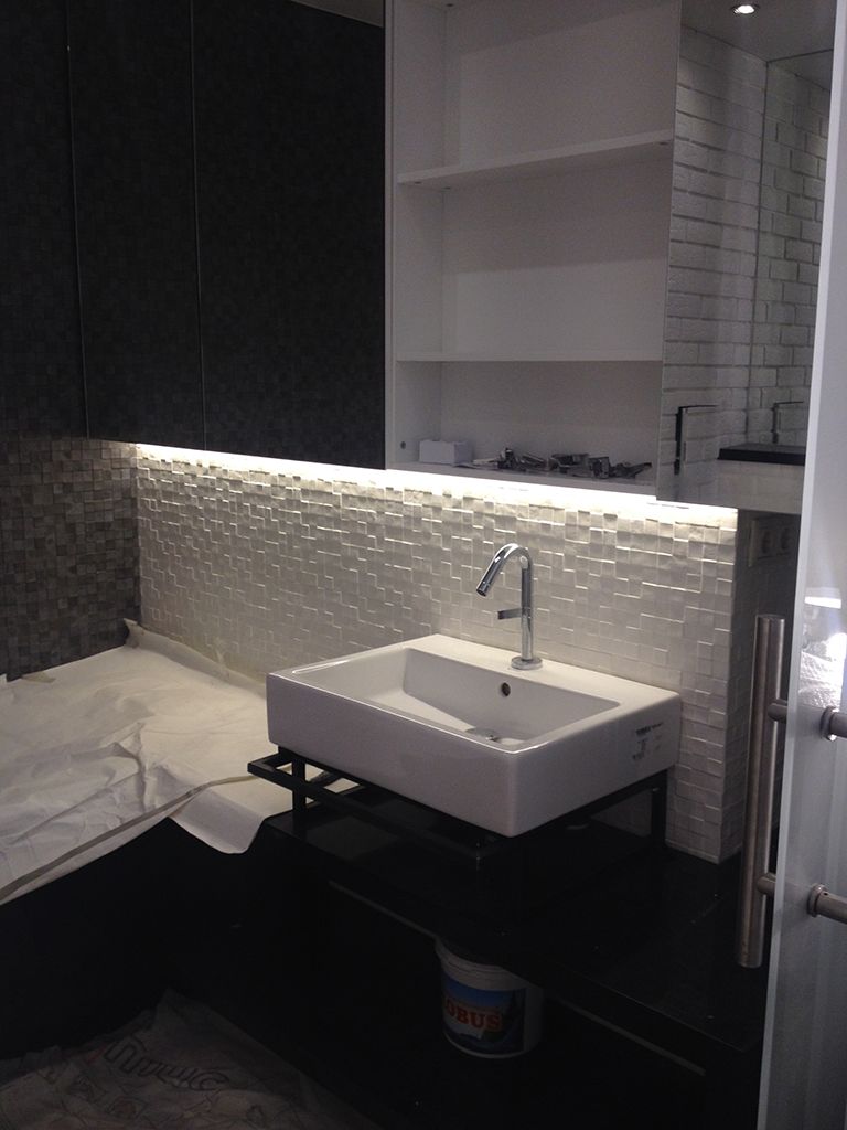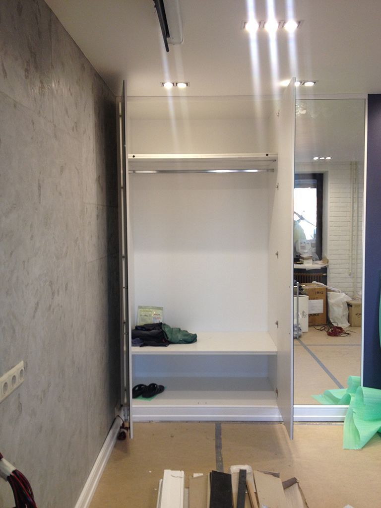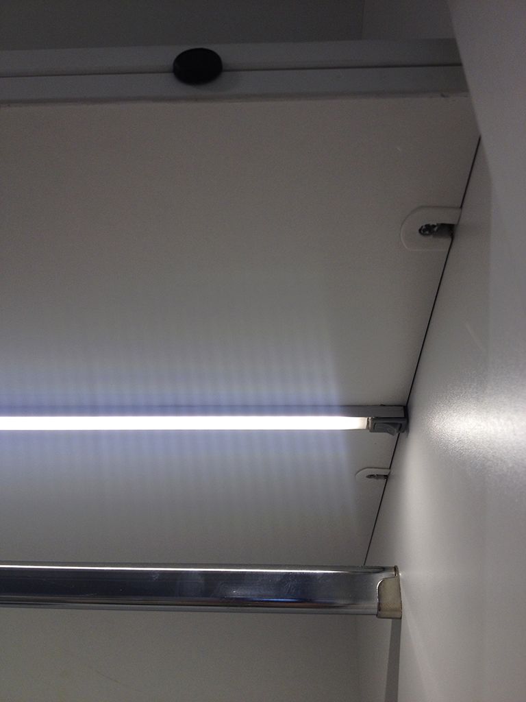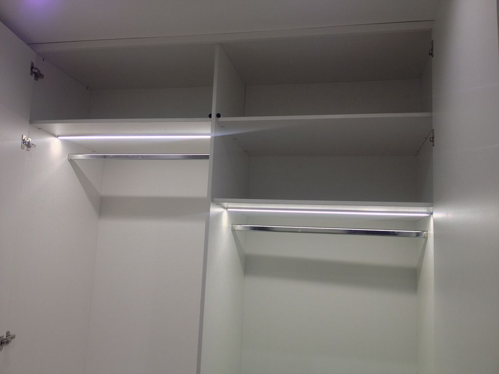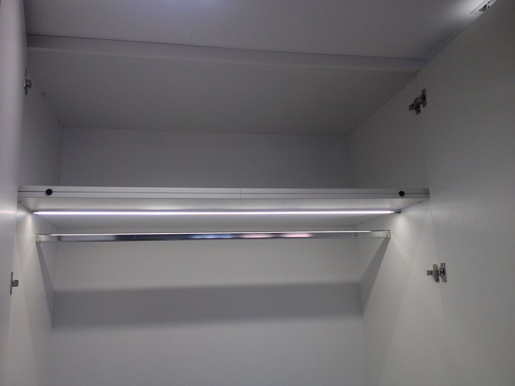 Другая часть функциональной подсветки в проекте - подсветка шкафов. Освещение гардеробов требуется не постоянно, поэтому было решено включать его только при открытии дверей. Для этого были установлены специализированные выключатели с датчиками открытия дверей, поэтому открыв двери, не требуется совершать дополнительных действий, например, нажимать на кнопку включения. Освещение шкафов включается автоматически при открытии дверей и выключается при их закрытии. Для того, чтобы датчики не бросались в глаза, и одежда не могла зацепиться за них, они были врезаны в полки шкафов. Конструкция светодиодных светильников, установленных в гардеробы, аналогична светильнику на кухне: в светодиодный профиль Arlight установлена светодиодная лента белого свечения и закрыта матовым светопропускающим экраном.