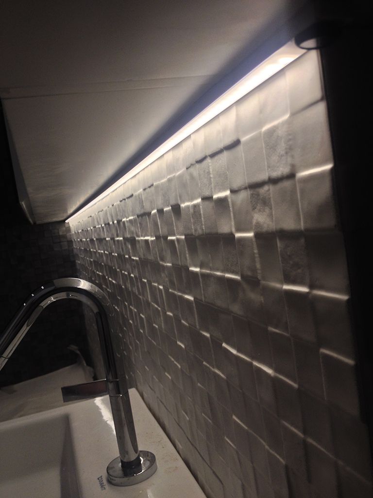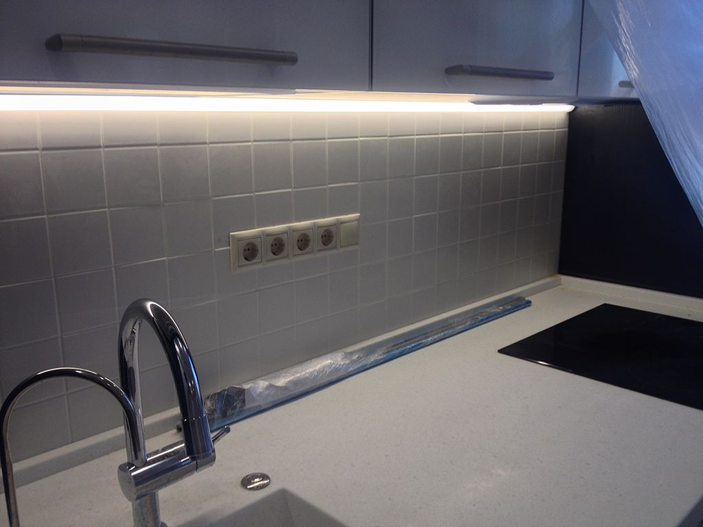 Первое - это подсветка рабочей зоны кухни - её столешницы. Для этого на нижнюю сторону навесных шкафов установили алюминиевый профиль для светодиодных лент, в нём поместили светодиодную ленту Arlight, а сверху её закрыл белый матовый экран, делающий свечение более рассеянным и мягким. Для включения и выключения подсветки был установлен выключатель с бесконтактным сенсорным датчиком. Благодаря нему включать и выключать освещение удобно даже с мокрыми или занятыми руками - достаточно просто поднести руку в область действия датчика.