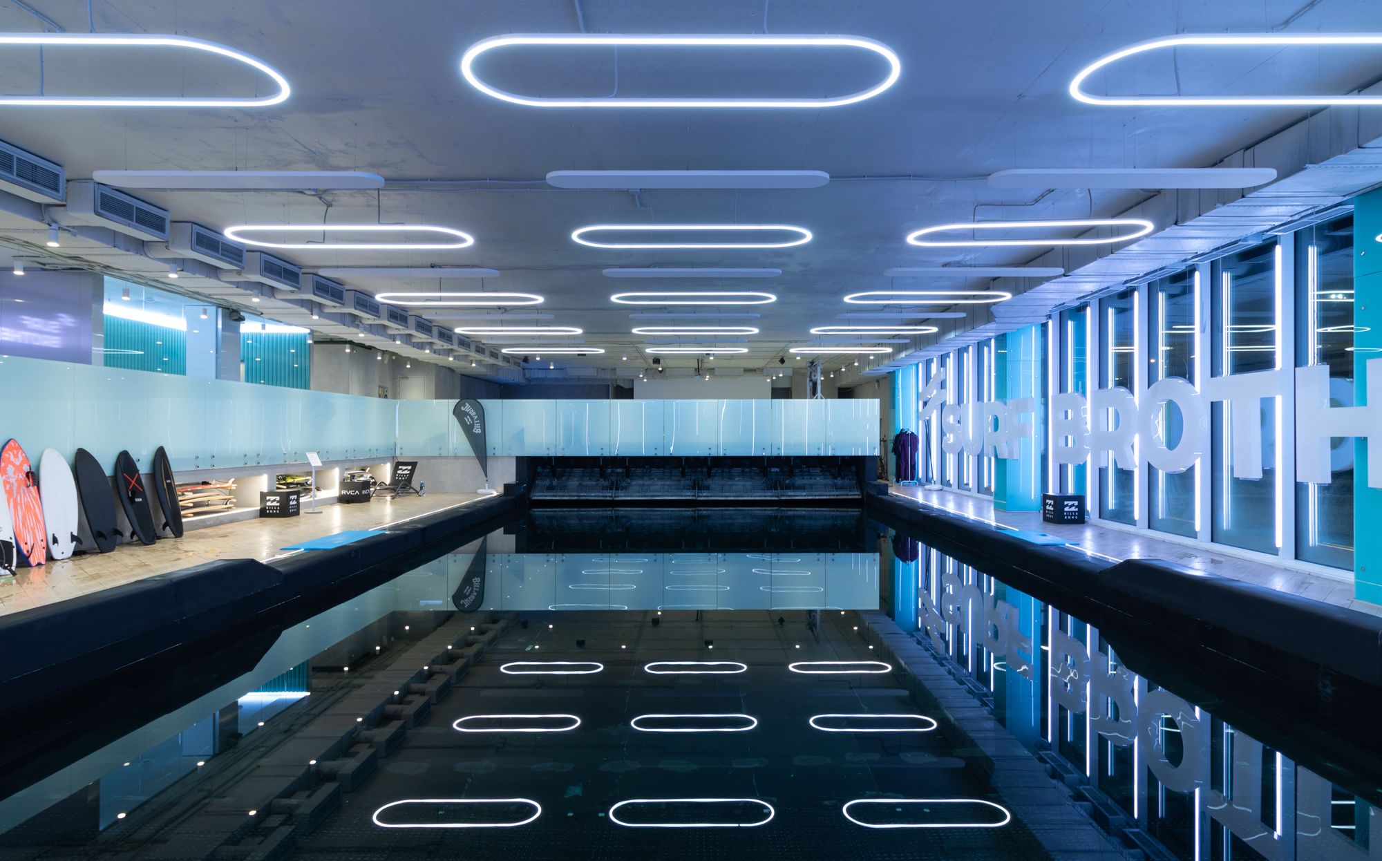 Подвесные светильники из дугового профиля управляются по протоколу DALI и DMX512 с возможностью реализации динамического освещения под фоновую музыку. В серфинг-центре предусмотрены датчики движения в проходных зонах и аварийное освещение.