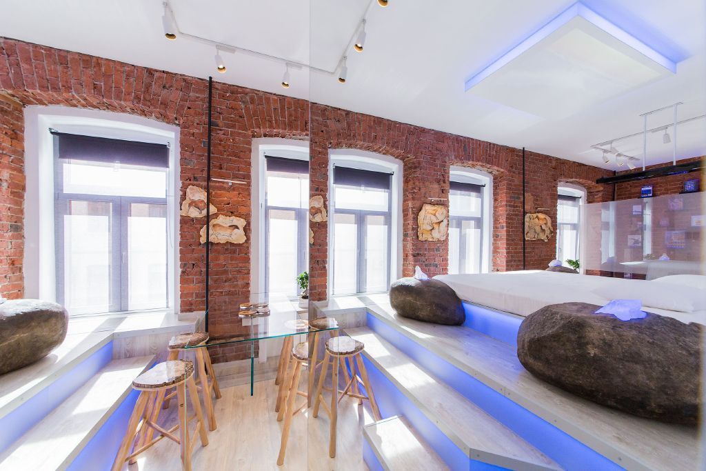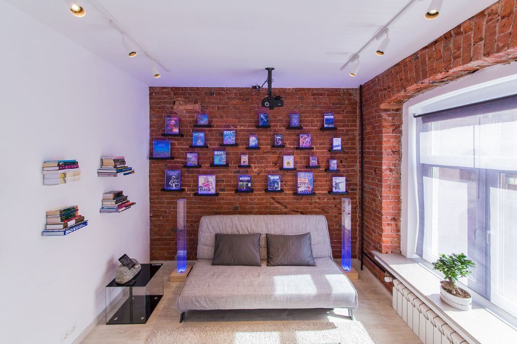 Дальнюю стену помещения разбавили небольшими книжными полками с боксами из плексигласа, в которые вложены книги, все эти боксы также имеют подсветку.