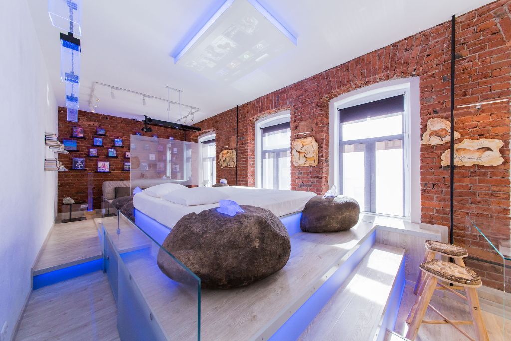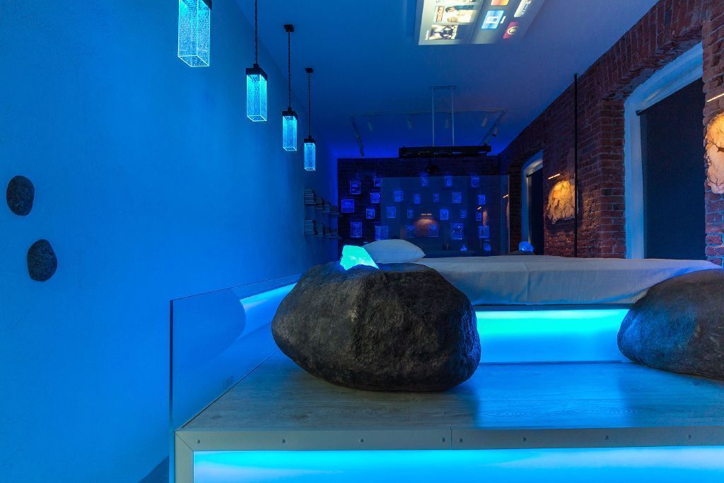 Прямо над кроватью была установлена объемная конструкция, выполняющая роль экрана для проектора, который получил фоновую подсветку. По углам кровати разместились большие камни, в которые буквально "вросли" кристаллы, также получившие светодиодную подсветку.