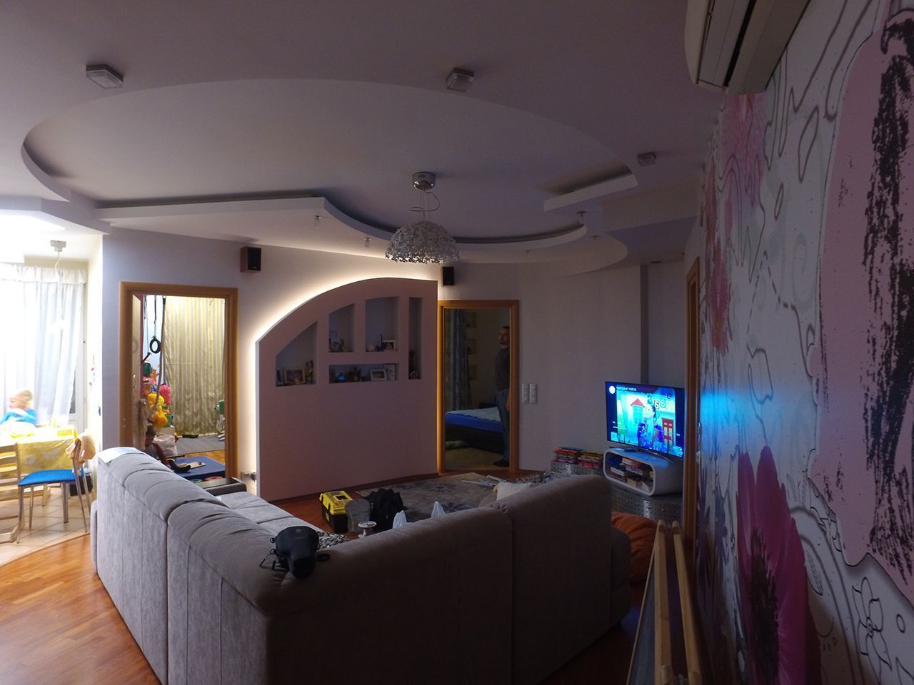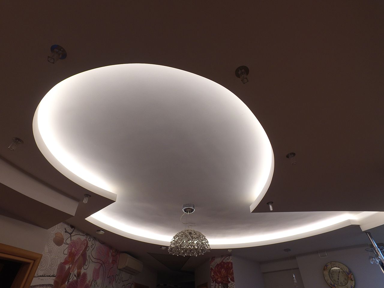 Данная подсветка имеет декоративный характер и используется для выделения ниши от основной поверхности стены. Лампа и проводка демонтированы, определены места установки ленты. После включения подсветки результат превзошёл ожидание хозяев квартиры, свечение стало абсолютно равномерным, без затемнённых участков, и при этом без избыточной яркости, т.к. выбрана светодиодная лента smd3528 30 светодиодов на метр.